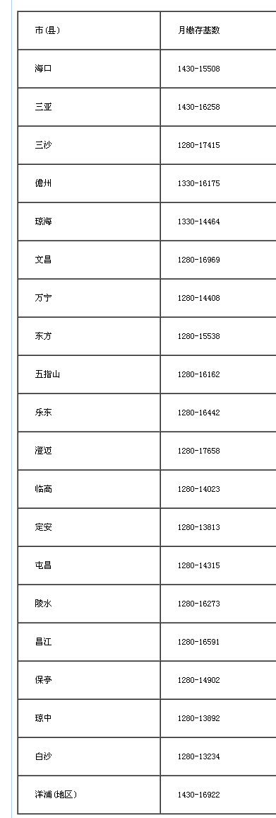 按照《住房公积金办理条例》及《关于住房公积金办理若干具体问题的指点看法》(建金管〔2005〕5号)的相关,根据《海南省人平易近关于调整最低工资尺度的通知》(琼府〔2016〕25号)及省统计局发布的2016年相关正在岗职工年平均工资,2017年度住房公积金缴存基数范畴如下: